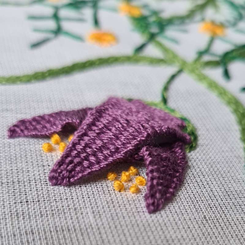 Each of the botanical designs uses embroidery stitches such as Picot Stitch, Braided Chain Stitch, Colonials Knots, and Turkey Work.