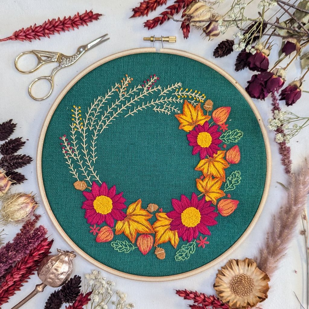 ✨ Quality Materials: organic and ethically produced fabric, vibrant DMC threads, a wooden embroidery hoop, and an embroidery needle. The Autumn Wreath pattern is printed on adhesive Solvy paper, so all you need to do is follow the lines!