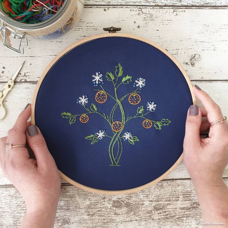 Detail view of orange tree hand embroidery on navy fabric