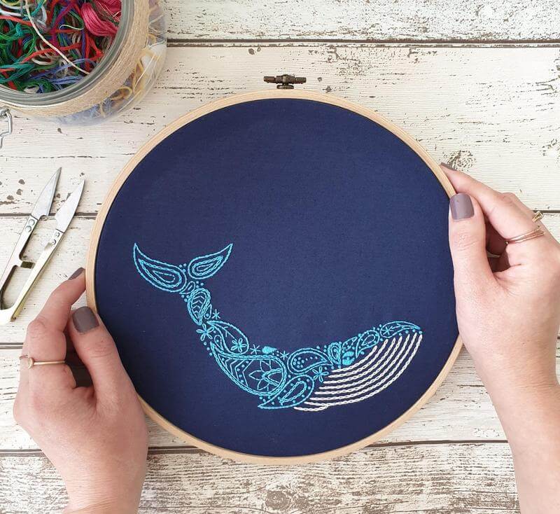 This paisley Whale banner kit is perfect for beginners learning the basics of hand embroidery.