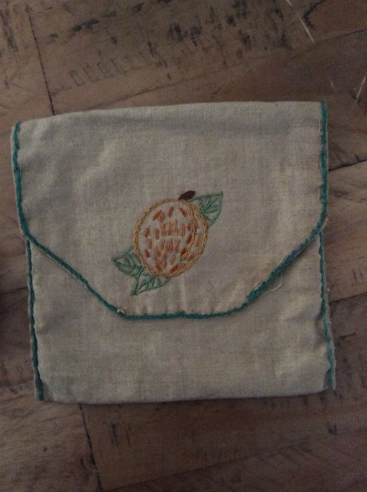 An angled closeup of the left side of a finished sampler embroidery design on cream fabric, made using this sampler embroidery kit