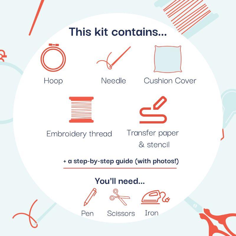 This kit has everything that you need to embroider your own fancy cushion cover - each one is designed to include ten types of embroidery stitch, and the guide included gives comprehensive instructions for each one. The cushion cover included is premade, Fairtrade and Organic, with a zip opening - so no difficult sewing required, just the lovely embroidery!