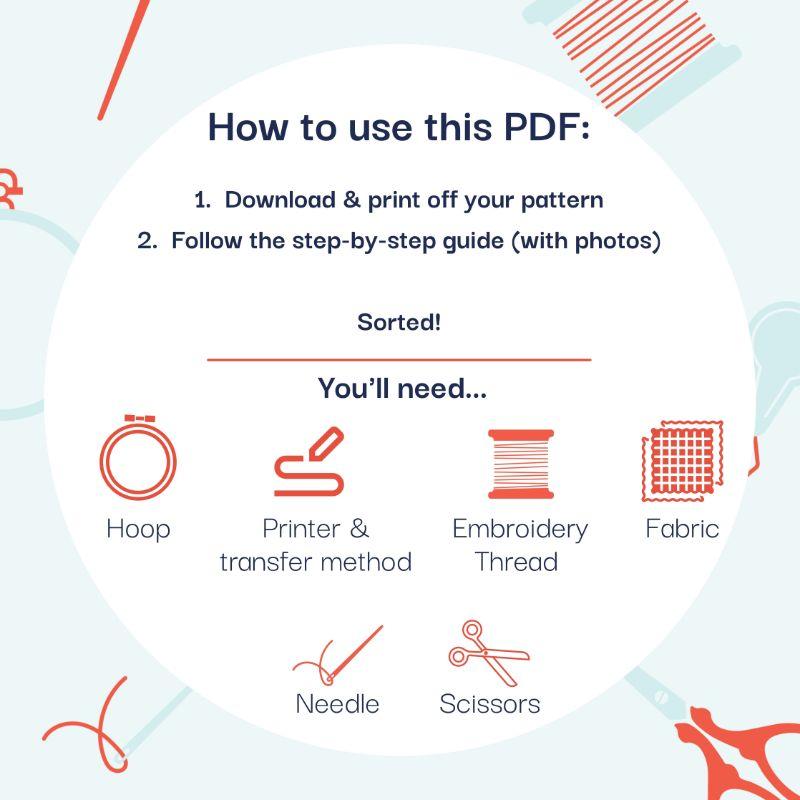 This is a PDF download only, so you will need to source fabric, embroidery thread, needles, an embroidery hoop, and dressmaker's carbon paper (all easy to find online and elsewhere if you don't have them at home already). Please make sure that you have a PDF reader (e.g. Adobe Acrobat), and access to a printer.