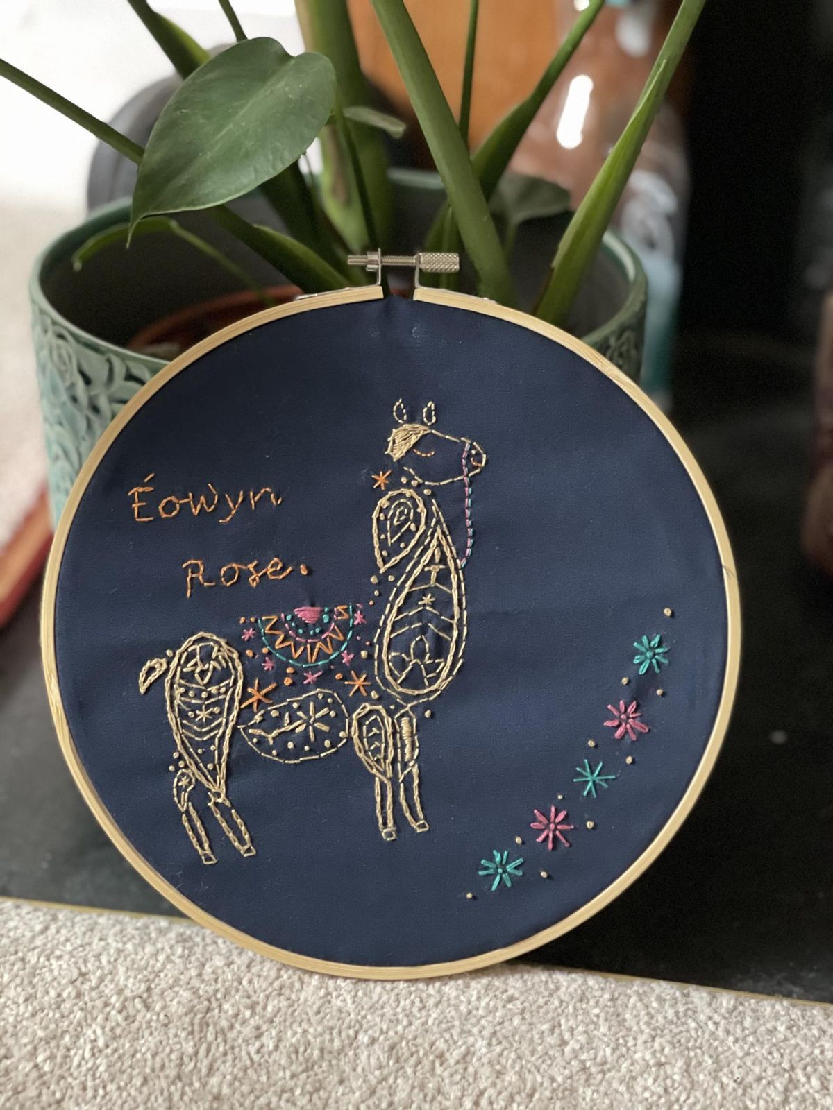 An embroidery hoop containing navy fabric, stitched with a paisley Llama design.