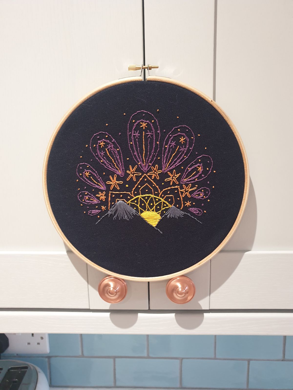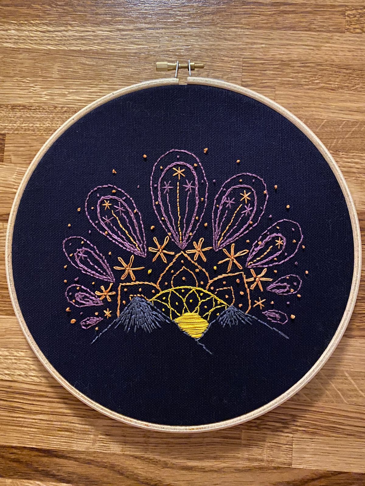 An angled closeup of a sunset embroidery design on navy fabric. Made using this sunset embroidery kit product.