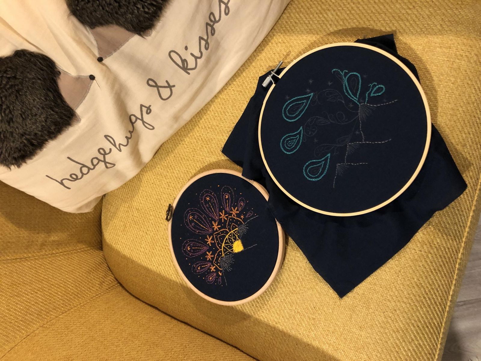 A finished sunset embroidery design on organic navy fabric, with thread and accessories surrounding it. Made using this sunset embroidery kit product.