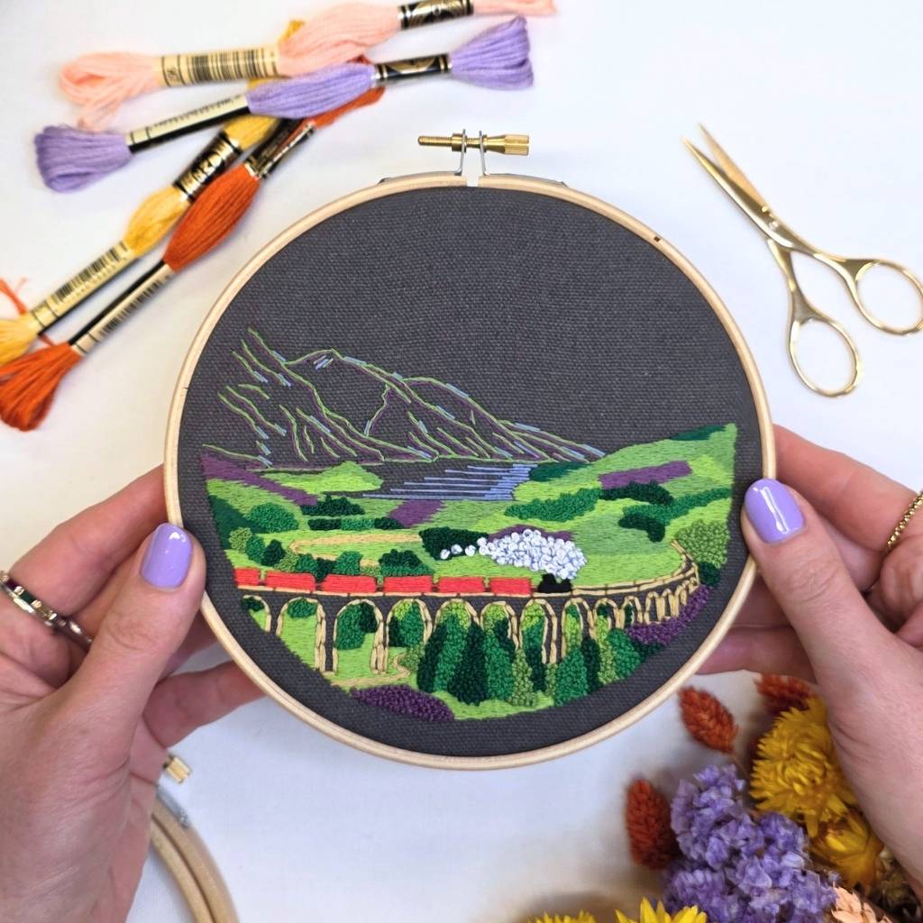 Inspired by one of Scotland's most recognisable sights - the Glenfinnan Viaduct is a historic railway bridge in the Highlands, frequented by the Jacobite steam train and known for its appearance in the Harry Potter films. This picturesque design showcases the best of Scottish landscapes, featuring gorgeous hills, heather and more! Packed into a 6-inch hoop, this is perfect for your next embroidery project!